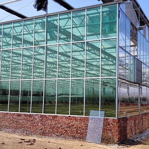 虽然大多数时候玻璃温室都是依靠自然通风来调节环境,但在夏季气温较高时,室外温度大于33℃的炎热天气下,当温室温度高于33℃时,采用强制通风并配合其他措施减少温室温度是一种常见的方法。强制通风是利用风机将电能或其他机械能转化为风能,强迫气流进行温室通风,达到降温。强制通风的理论冷却是室内空气温度等于室外空气温度。因为此时温室内外温差小,通风量就大,在实际应用中是不可能的。由于机械设备和植物的原因,一般温室的通风强度为0.75-1.5次/分钟,可将温室内外温差控制在5℃以内。